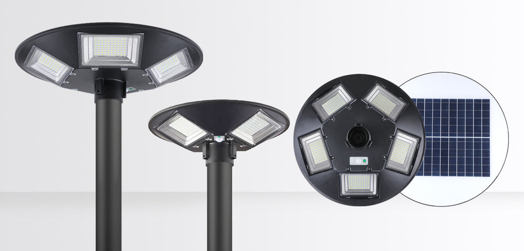 Lampe solaire pour extérieur - Série OVNI EMERAUDE - 400 Watts - 2300 Lumens - Angle 360° - IP65 - Lampe 61 x 61 cm - Panneau polycristallin 48 x 35 cm - Tube d'insertion 60/76 mm - Détecteur de mouvement - Capteur crépusculaire - Télécommande - 6000k