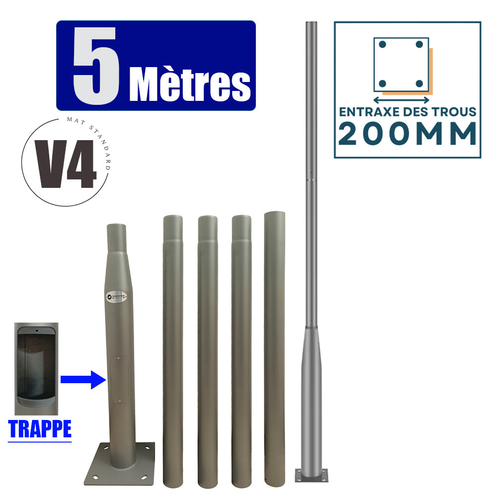 Mât / Poteau pour lampe de rue - Nouveau design - Série STANDARD V4 EVO avec TRAPPE - Vis antivol - 5 mètres - Entraxe latéral des trous 200mm - Couleur GRIS - Finition épurée